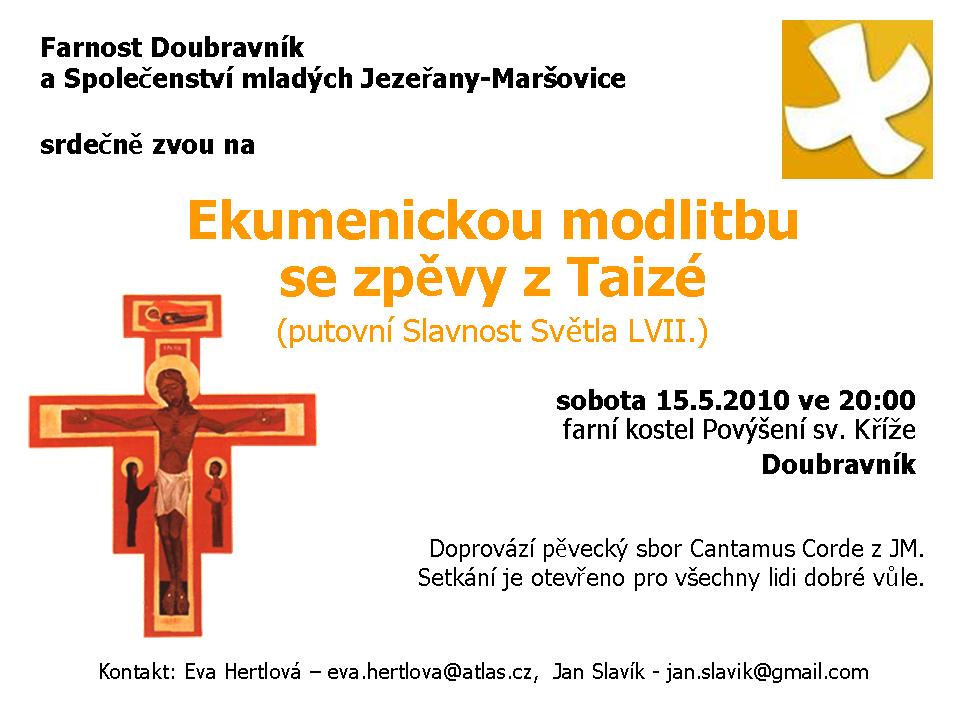 Pravidelná ekumenická modlitba se zpěvy z Taize se u nás v kostele uskutečnila posledně v sobotu 20.2.2010 ve 20:00. Více info na letáku.